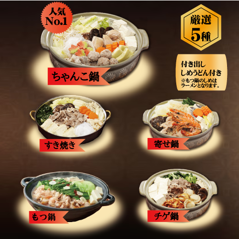 ※ちゃんこ鍋・寄せ鍋・チゲ鍋・すき焼き・しゃぶしゃぶのいずれかお一つお選びください。